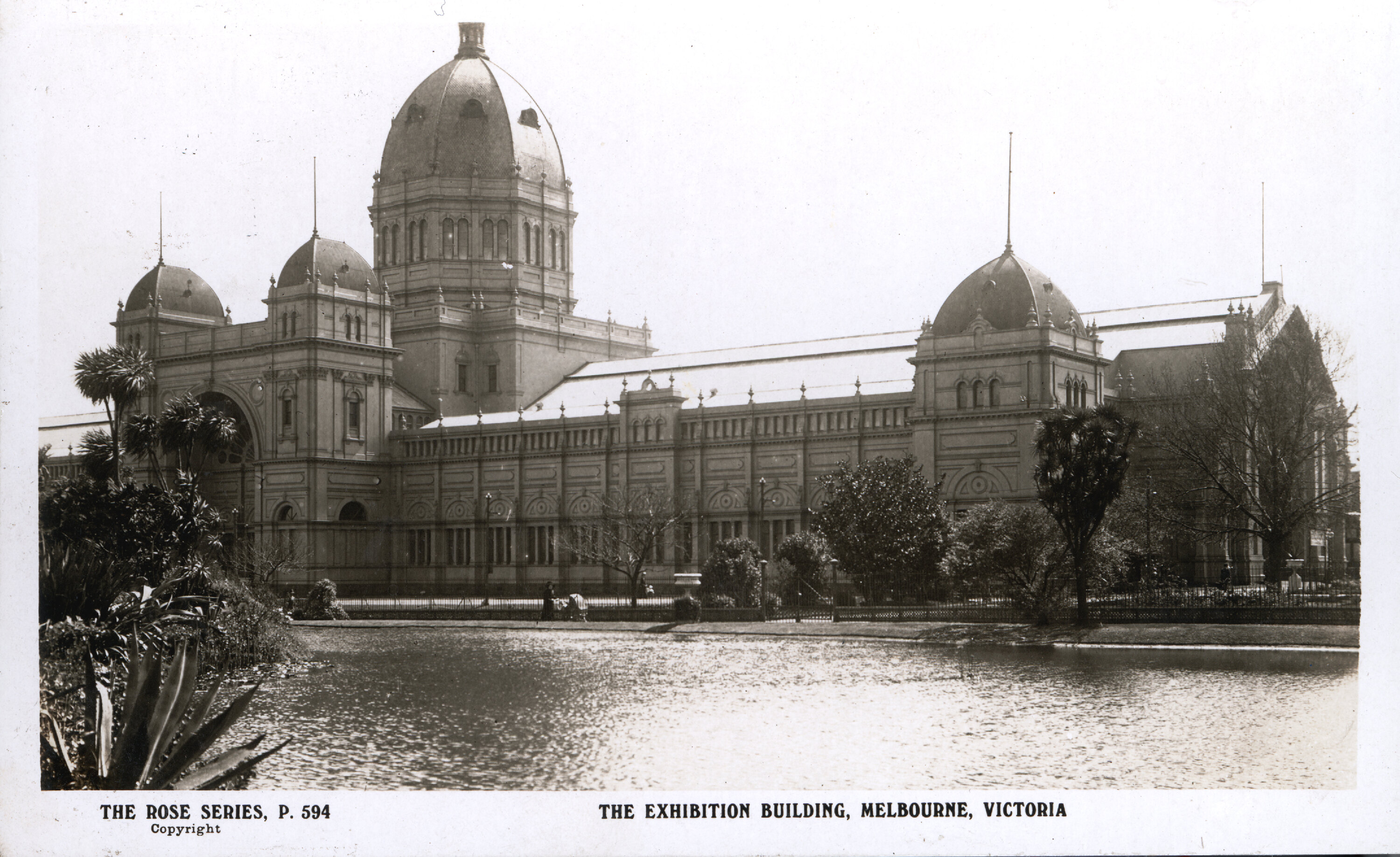 Obverse, text: EXHIBITION BUILDING, MELBOURNE, VIC; SOUTHERN CROSS SERIES P594 Reverse, text: REAL PHOTO; POST CARD; THE "ROSE" SERIES DE LUXE; PRODUCED IN AUSTRALIA; PUBLISHED BY "THE ROSE STEREOGRAPHS/ Armadale, Victoria.