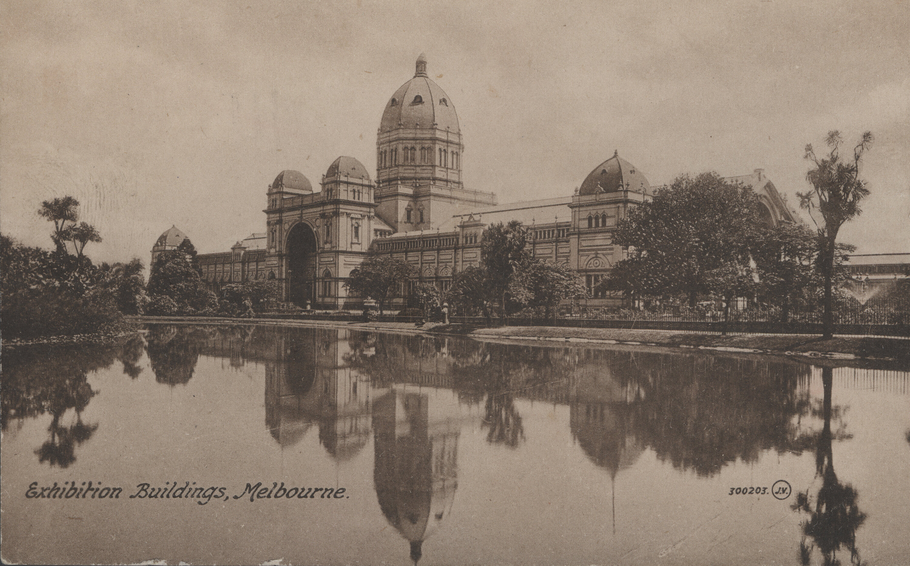 Obverse, text: Exhibition Buildings, Melbourne.; 300203. JV. Reverse, text: POST CARD; PRINTED IN GREAT BRITAIN; This space may be used for Communication; The Add written/ h/ [damage to postcard]; The Valentine & Sons' Publishing Co., Ltd.,/ Melbourne and Sydney
