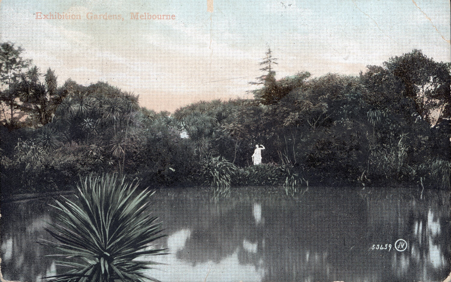 A colour tinted postcard showing the lake in the gardens at the Exhibition Building, Melbourne. The scene looks across the water to a statue of a woman on the far side of the lake. The lake is surrounded by trees and shrubs. The sky is tinted in shades of orange and blue. On the reverse, there is a handwritten message in black ink. There is an orange one penny postage stamp in the the upper right hand corner. There is no date or postmark.
