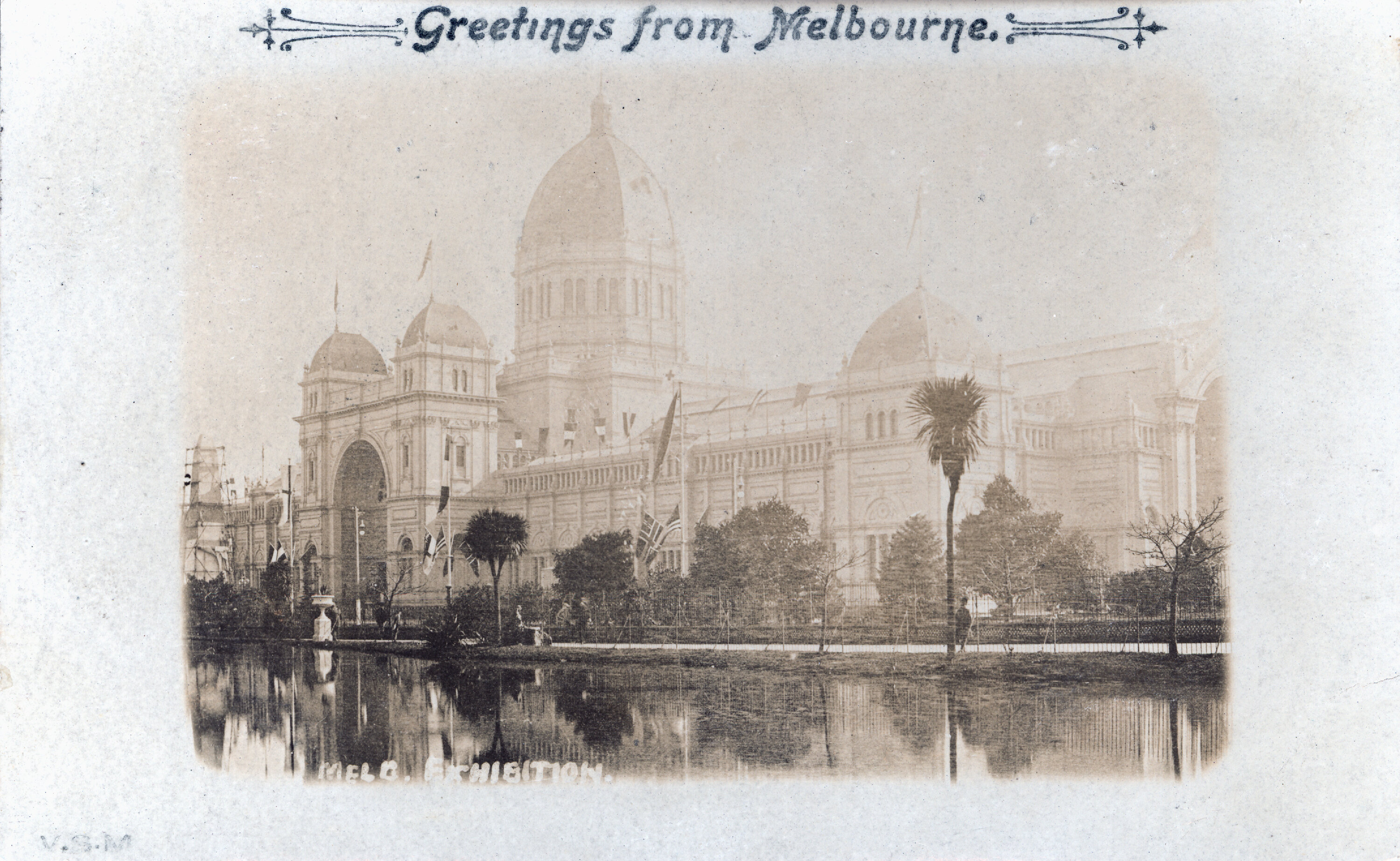 This is a sepia coloured postcard of the southern facade of the Exhibition Building with the lake in the foreground, circa 1907. The card, which was printed as part of the Victoria Stamp Market (VSM) Series, was sent to Miss May McClure of Cobden and is postmarked 6 July 1907.