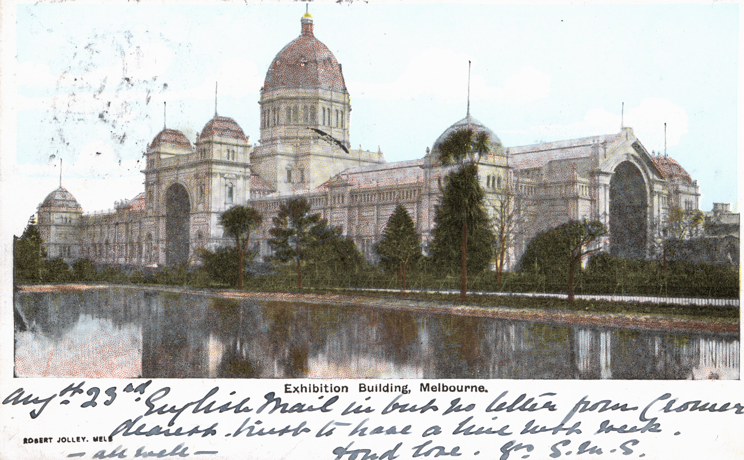 Obverse, text: Exhibition Building, Melbourne.; ROBERT JOLLEY, MELB. Obverse, handwritten: Aug 23rd. English Mail in but no letter from Crowser/ dearest. ... to have a line next week./ - All well- . Fond love. Srs S.M.S. Reverse, text: POST CARD; THE ADDRESS ONLY TO BE WRITTEN ON THIS SIDE Reverse, handwritten: The/ Rev'd Mother Superior/ The Sisterhood/ Belper (?)/ Derbyshire/ England Reverse, postmarked: MELBOURNE/ PM/ 1230/ 24.8.04