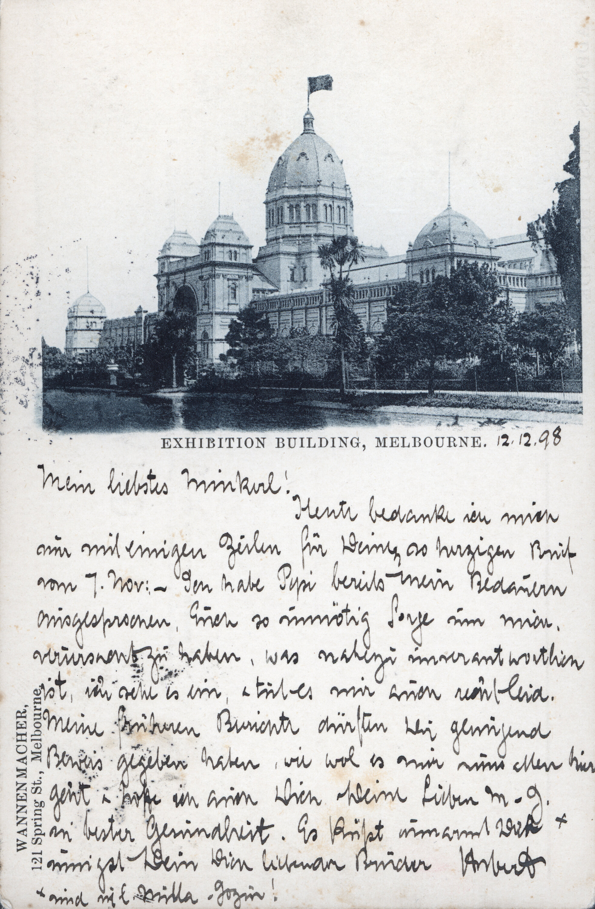 Obverse, text: EXHIBITION BUILDING, MELBOURNE.; WANNENMACHER./ 121 Spring St., Melbourne. Obverse, handwritten: [Inscription in German] Reverse, text: POST CARD./ This card may pass through the Post without additional postage to any of/ the following Colonies, namely: - New South Wales, South Australia, Queensland,/ Tasmania, Western Australia, New Zealand, and Fiji.; To; ADDRESS ONLY THIS SIDE. Reverse, handwritten: Hochwalgeboun/ Frau Hermine Sanojca/ R. R. Hystm.'s (?) Gattin/ Korneuburg/ Austria Reverse, postmarked: MELBOURNE/ 60/ DE 14/ 98