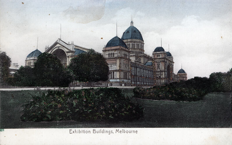 The Exhibition Building was built for the 1880 Melbourne International Exhibition, which opened to visitors on 1 October 1880. On 9 May 1901, it hosted the opening of the First Commonwealth Parliament of Australia. By the early 20th century, picture postcards of the Exhibition Building were a popular Melbourne souvenir.