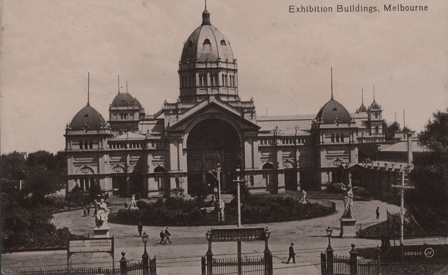 A black & white photograph of the Exhibition Building showing the eastern facade, annexe to the right, circular garden and path, statuary and lamps in garden, metal fence and gates into Nicholson Street, notices, statues and people. On the reverse there is a handwritten message and address in black ink. In the upper right hand corner there is a red one penny Australian postage stamp showing a profile of Edward VII and postmarked Western Australia, 26 April 1915. The card was written aboard the TSS Hororata at Fremantle and was published by Valentine & Sons.