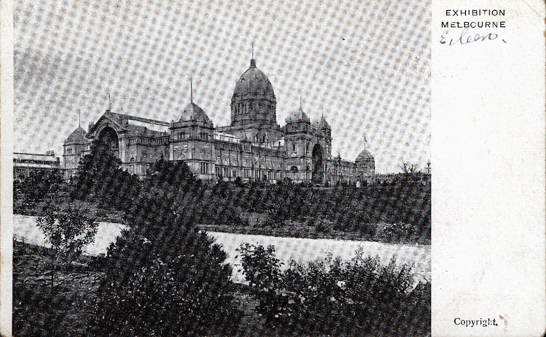 Obverse, text: EXHIBITION/ MELBOURNE; Copyright. Obverse, handwritten: Eileen Reverse, text: POST CARD; THE ADDRESS TO BE WRITTEN ON THIS SIDE; STAMP.
