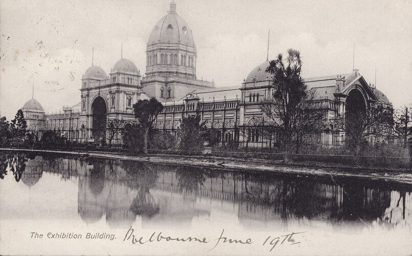 Obverse, text: The Exhibition Building. Obverse, handwritten: Melbourne June 19th Reverse, text: POST CARD.; THIS SPACE MAY BE USED FOR COMMUNICATION; FOR WRITING ADDRESS ONLY Reverse, handwritten: This is a good one/ of the Exhibition,/ isnt it? This set/ is one of the best/ I have seen, one of/ Robt Jolly's publication/ I got it at the Bazaar/ Gertie.; J.B. Roberts/ c/o Mrs Skillman/ 52 Penn Rd Villas/ Holloway/ London N.
