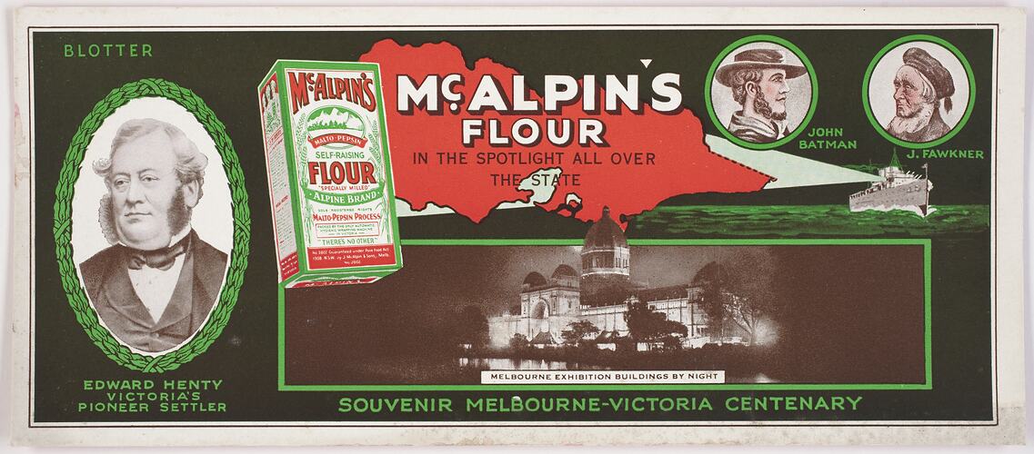 Blotter produced by McAlpin's Flour as a souvenir for the Melbourne - Victorian Centenary in 1934. It was issued by flour manufacturer J. McAlpin & Sons, whose products were sold under the McAlpin brand.