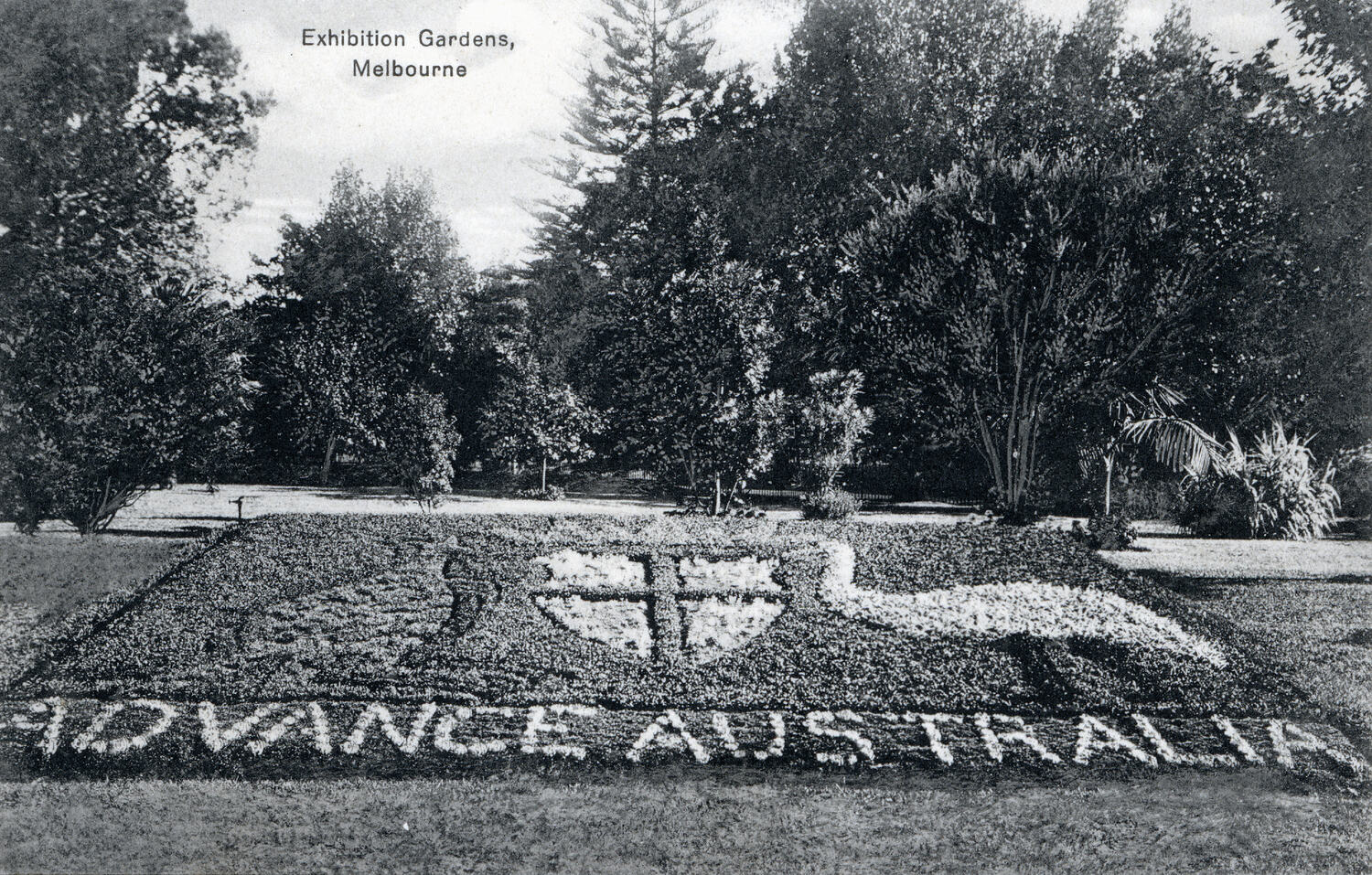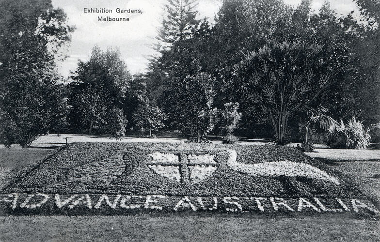 Sepia postcard of a floral arrangement in the Carlton Gardens. The postcard, which is unused, was made in Germany and depicts a shield, a kangaroo and an emu above the words 'Advance Australia'. Originally dated to around 1917, its manufacture in Germany would preclude a war-time date.