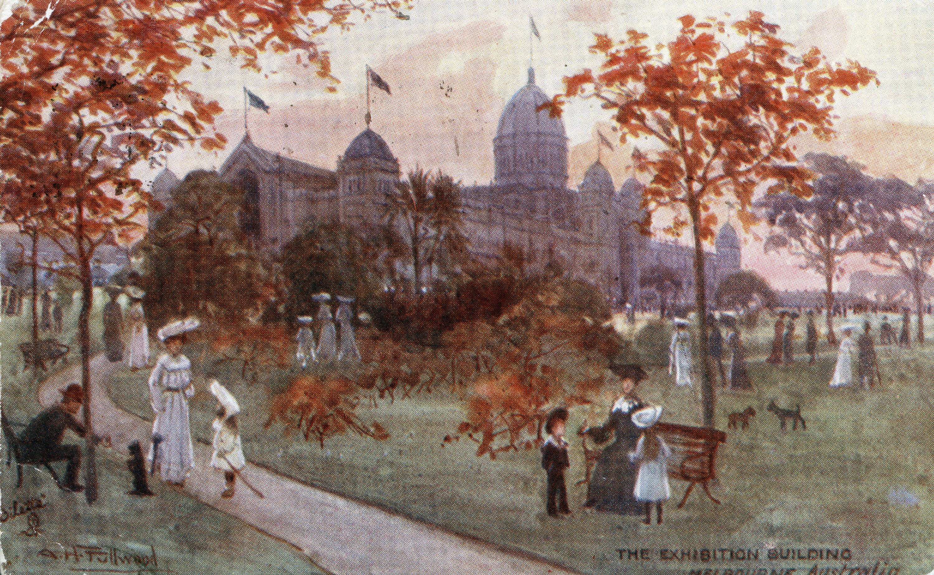 The Exhibition Building was built for the 1880 Melbourne International Exhibition, which opened to visitors on 1 October 1880. On 9 May 1901, it hosted the opening of the First Commonwealth Parliament of Australia. By the early 20th century, picture postcards of the Exhibition Building were a popular Melbourne souvenir.