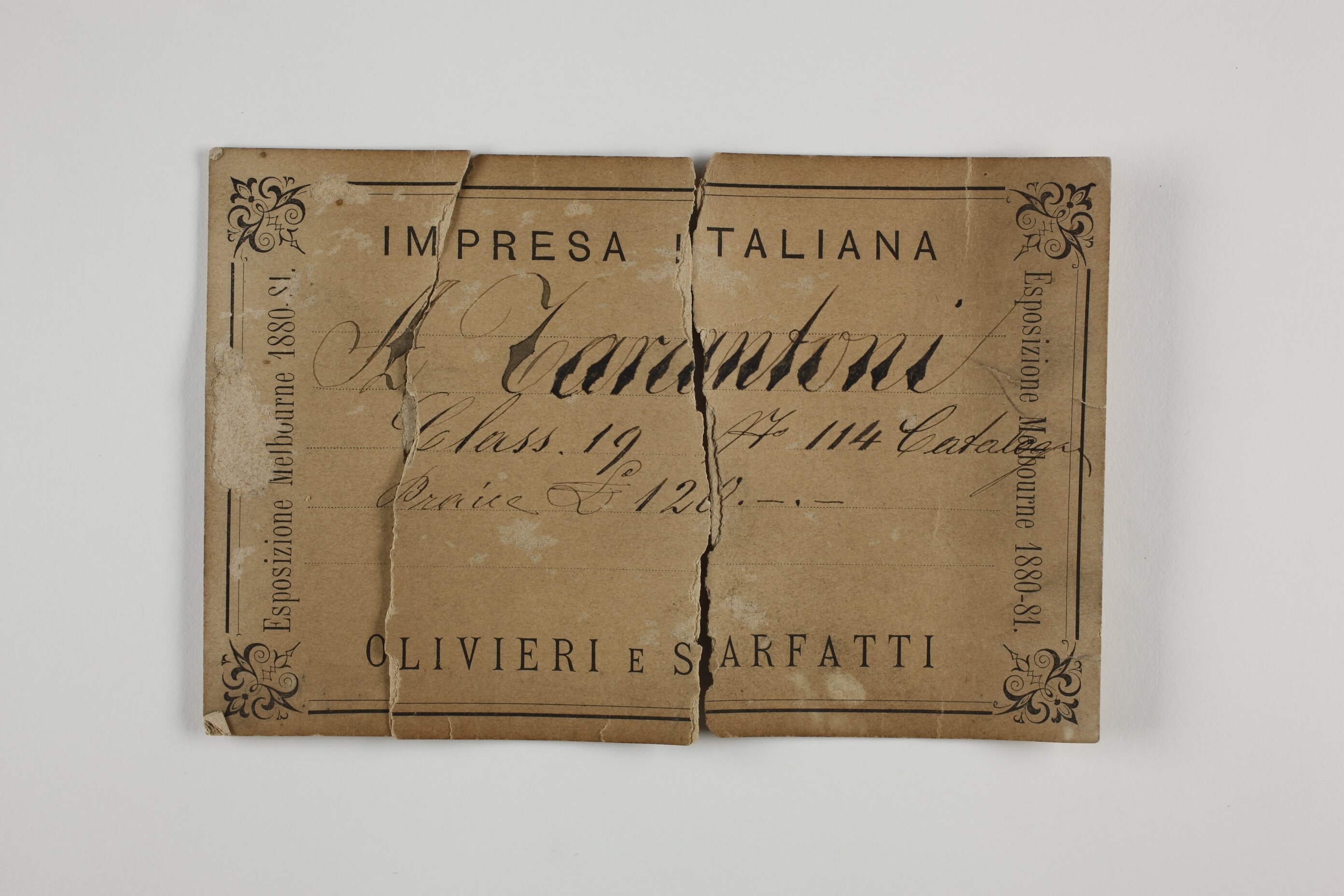Obverse: Black across top edge: IMPRESA ITALIANA Bottom: OLIVIERI E SARFATTI Vertical: Esposizione Melbourne 1880-81. Obverse: Handwritten: L Tarantoni/ Class 19 No 114 Catalogue / £Price 120._._
