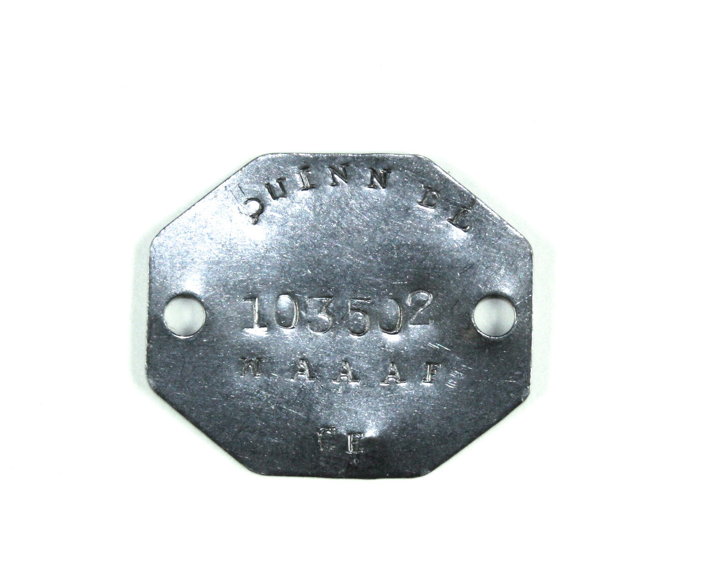 Octagonal metal identity tag with stamped name, number and religion: Silver in colour with holes on both sides.