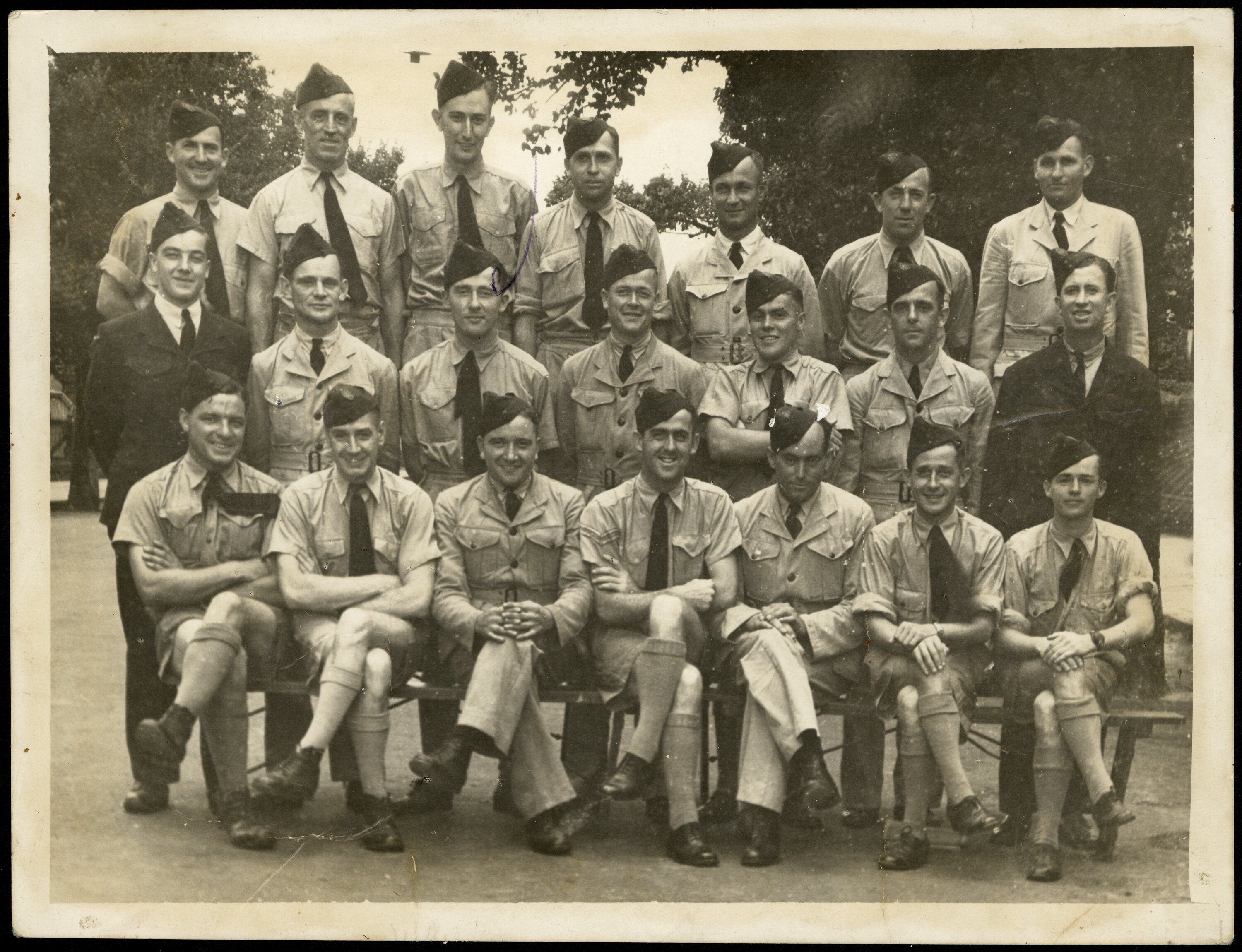 Black and white photograph of a group of Royal Australian Air Force personnel at the Exhibition Building, taken by the donor, Malcolm McLeod, while an electrician stationed at the Exhibition Building in 1941 and attending the Melbourne Technical College.