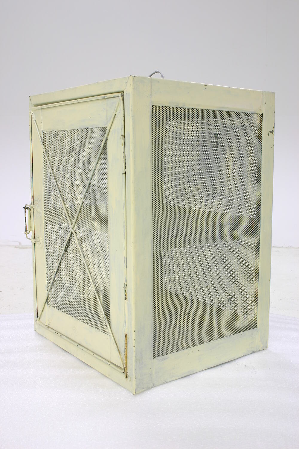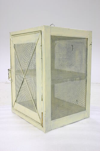 A rectangular, cream painted, metal meat safe. The four sides are covered with wire mesh. Base and top solid metal sheets. FRONT: Diamond lozenge moulded bottom centre. Full area DOOR - hinged, wire catch handle and locking mechanism middle left. Wire decoration in shape of an X applied to full area. TOP: wire loop handle. INTERIOR: double hook, centre of roof. 1 removable metal tray/ shelf, centre of safe.