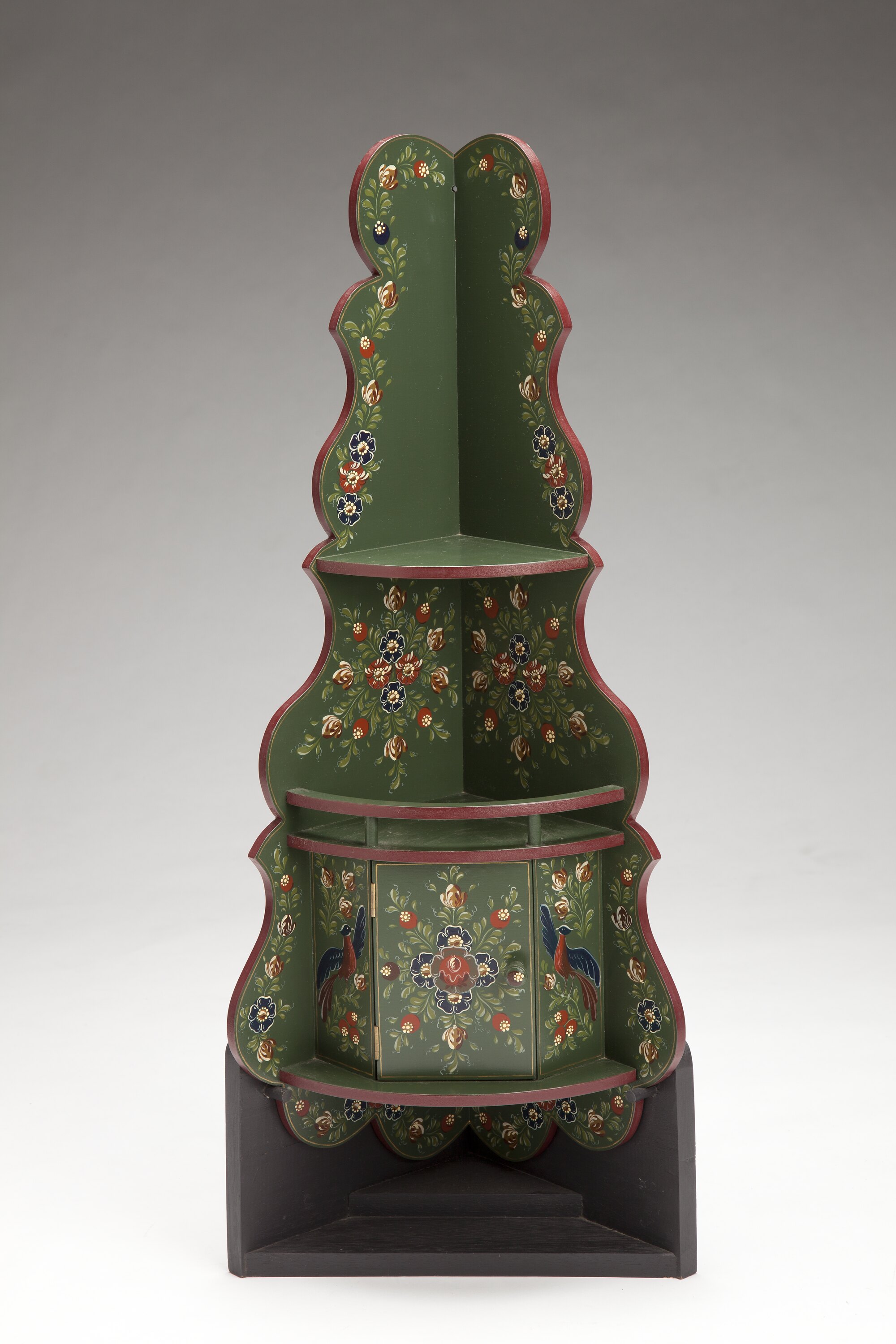 Wooden decorative shelf unit designed to fit in the corner of a room, can be hung. The unit is comprised of four shelves and is very ornately shaped. The unit has been painted in dark green and maroon with floral motifs in the Hindeloopen style.