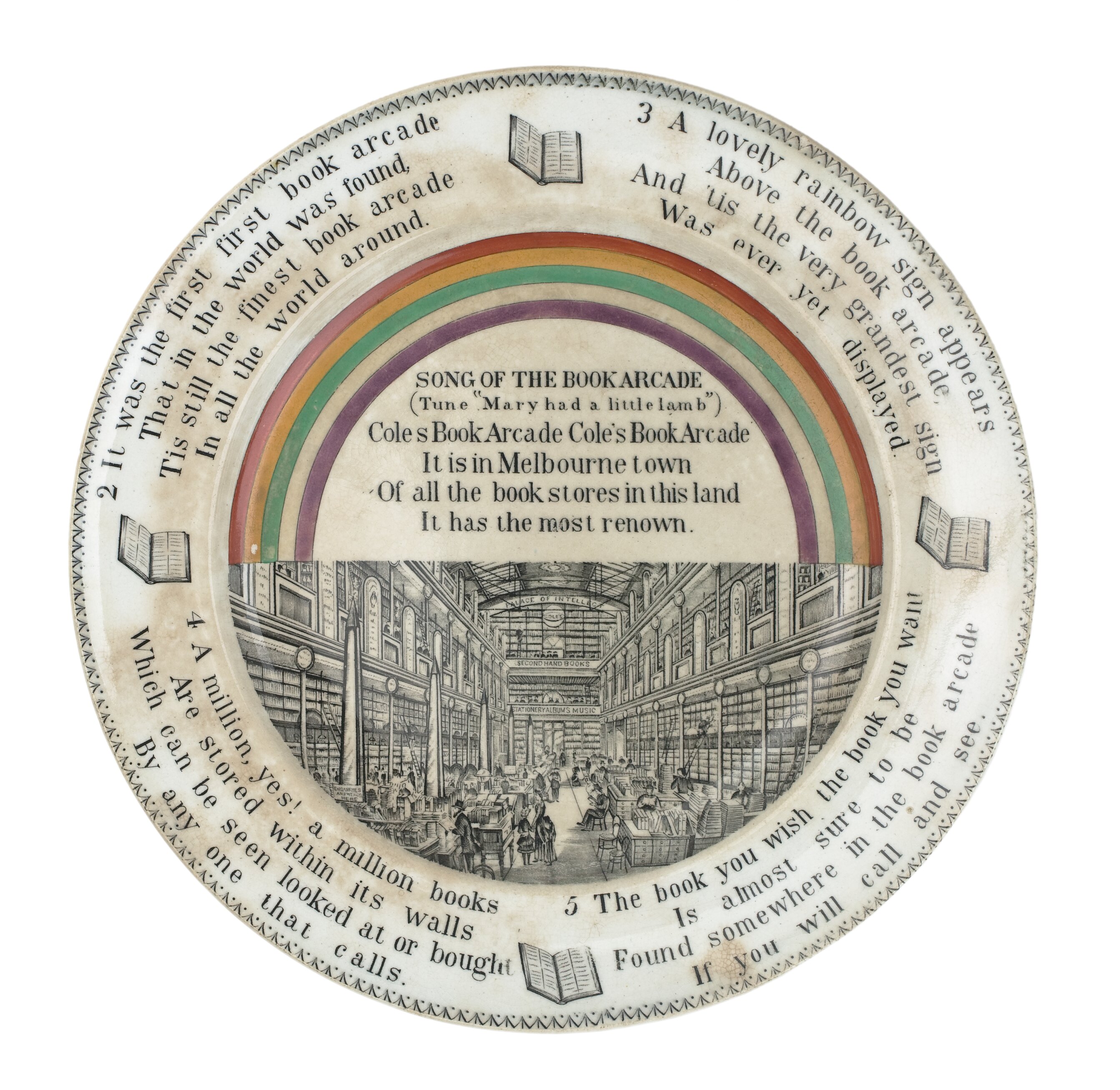 Commemorative plate made to advertise Coles Book Arcade in Melbourne, made in the late 19th century (originally dated to 1875-1880, but Cole didn't open his main Arcade until 1883, so it probably dates from later than that). The small earthenware plate has an image of the two-storied Book Arcade with customers browsing and reading. The words of a five-verse 'Song of the Book Arcade' (sung to the tune of Mary Had a Little Lamb'), are printed around the plate. There is also a five-coloured rainbow, the symbol of the Cole's Book Arcade.