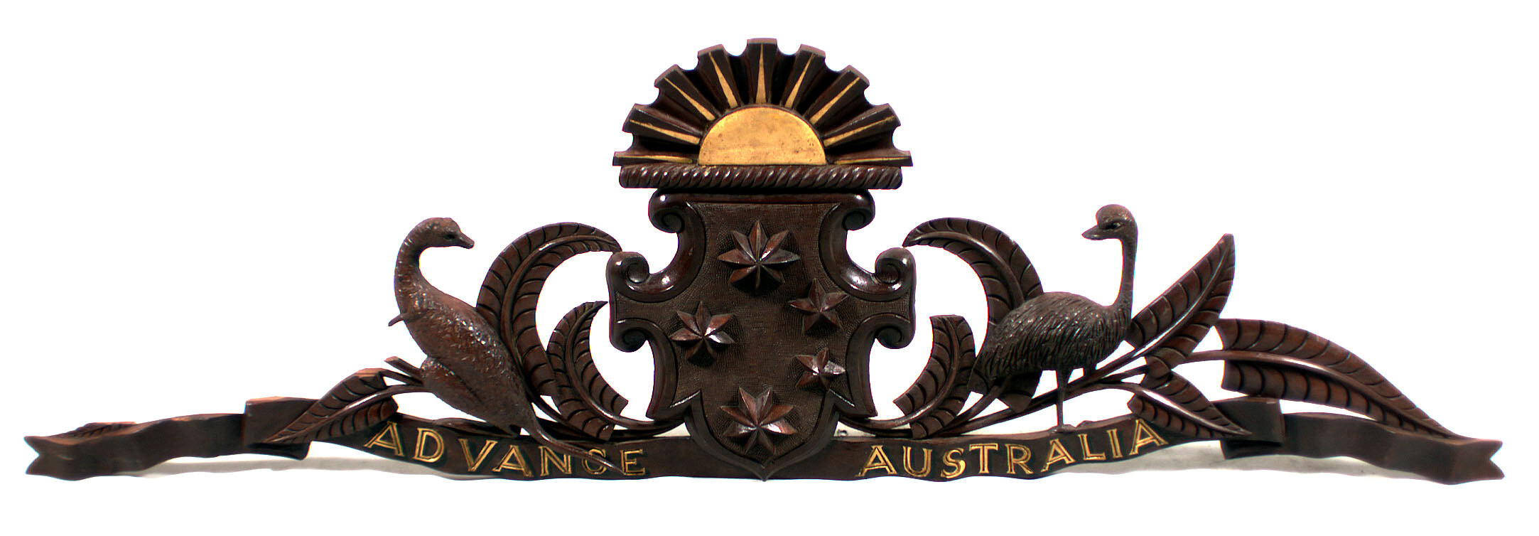 Wooden honour board crest featuring stylized kangaroo on left, emu on right and shield with five stars at centre, topped by a rising sun with gilt finish. Banner across bottom. Leaves on either side.