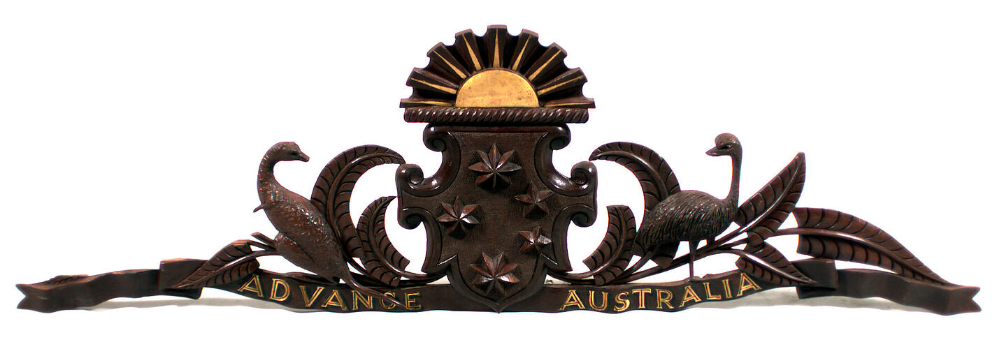 Carved wood crest or top ornament of an honour board made circa 1919-1930, featuring a coat of arms with kangaroo and emu, strongly reminiscent of the Australian coat of arms. Originally used in the East Kew Branch of the Australian Natives' Association. Originally crowned on honour board, likely to have commemorated people who served in World War I.
