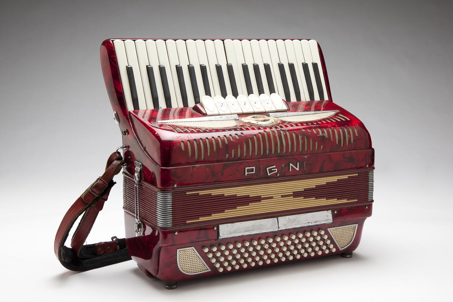 Piano Accordion, manufactured by Marino Pigini in the Castelfioardo region of Italy. Castelfioardo is known as the international capital of accordion builders. Brought to Australia by an Italian migrant.