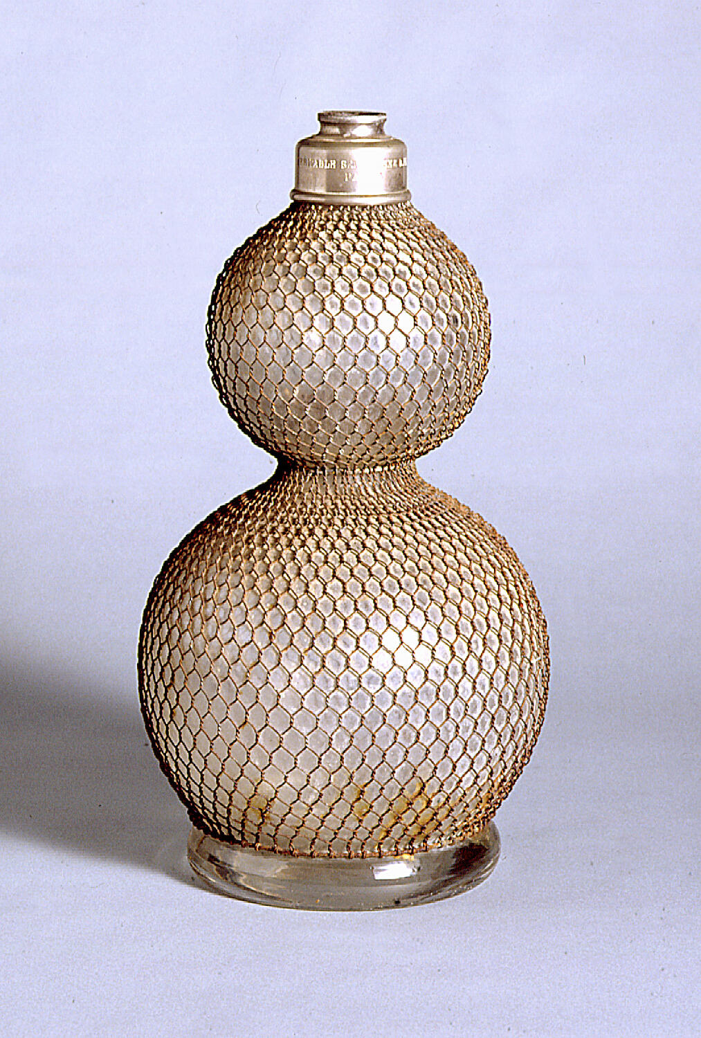 Large, glass, soda water syphon consists of large, hollow glass ball surmounted and leading into small ball on top of which is metal fitting into which screws the spray (missing). Syphon is on a slightly protruding, flat, circular base. It is covered in a wire net (rusty).