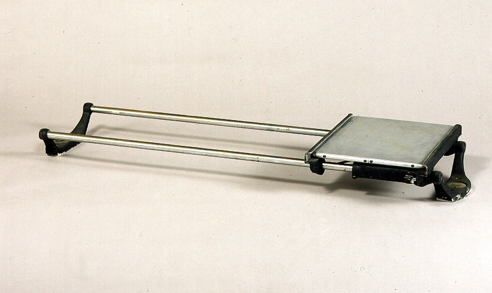 X-ray cassette and holder with 2 x 1 metre rods, joined at each end by shallow U-shaped bracket (2 screw holes). Cassettes held in square iron frame (painted black and with 2 curved diagonals) which has tracks top and bottom into which cassette slides. Height can be adjusted by sliding holder up or down vertical rods. Cassette is stain steel tray with thick sides and flat hinged lid, re-inforced by thick metal frame with network of diagonal bars and 2 swivelling shafts across centre which lock in to catches on either side of base. Lid has leather strip handle and hinges and is lined with felt. (Cassette is jammed in holder by 1 securing shaft which is badly bent.)