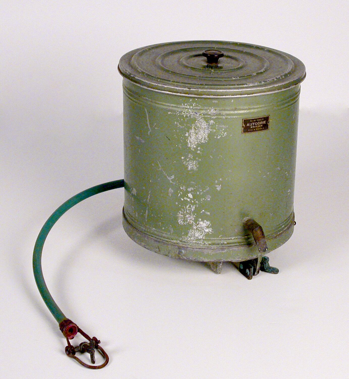 Autodrie Wringer, hand-powered. Small green-coloured cylinder with an internal drum and external hose attachment. It was made in Australia circa1933 and used in Glen Iris, Victoria, circa 1939-1942.