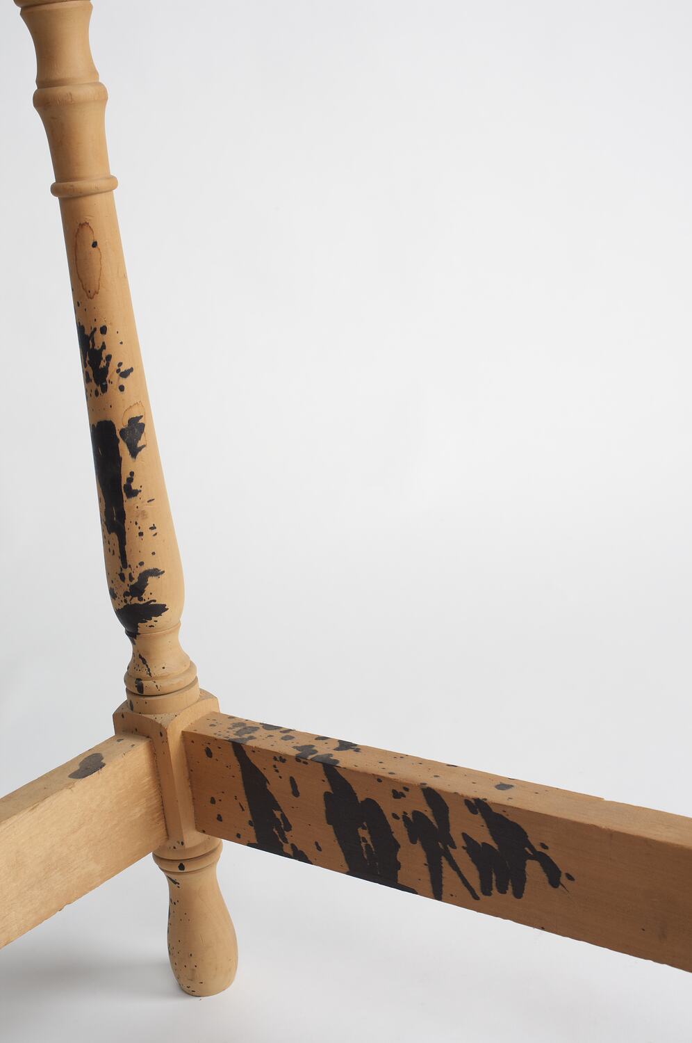 Frame and turned wooden legs of a yet to be completed table. The wooden frame is untreated and is without a top. Black ink has been splashed on the lower portions of the table.