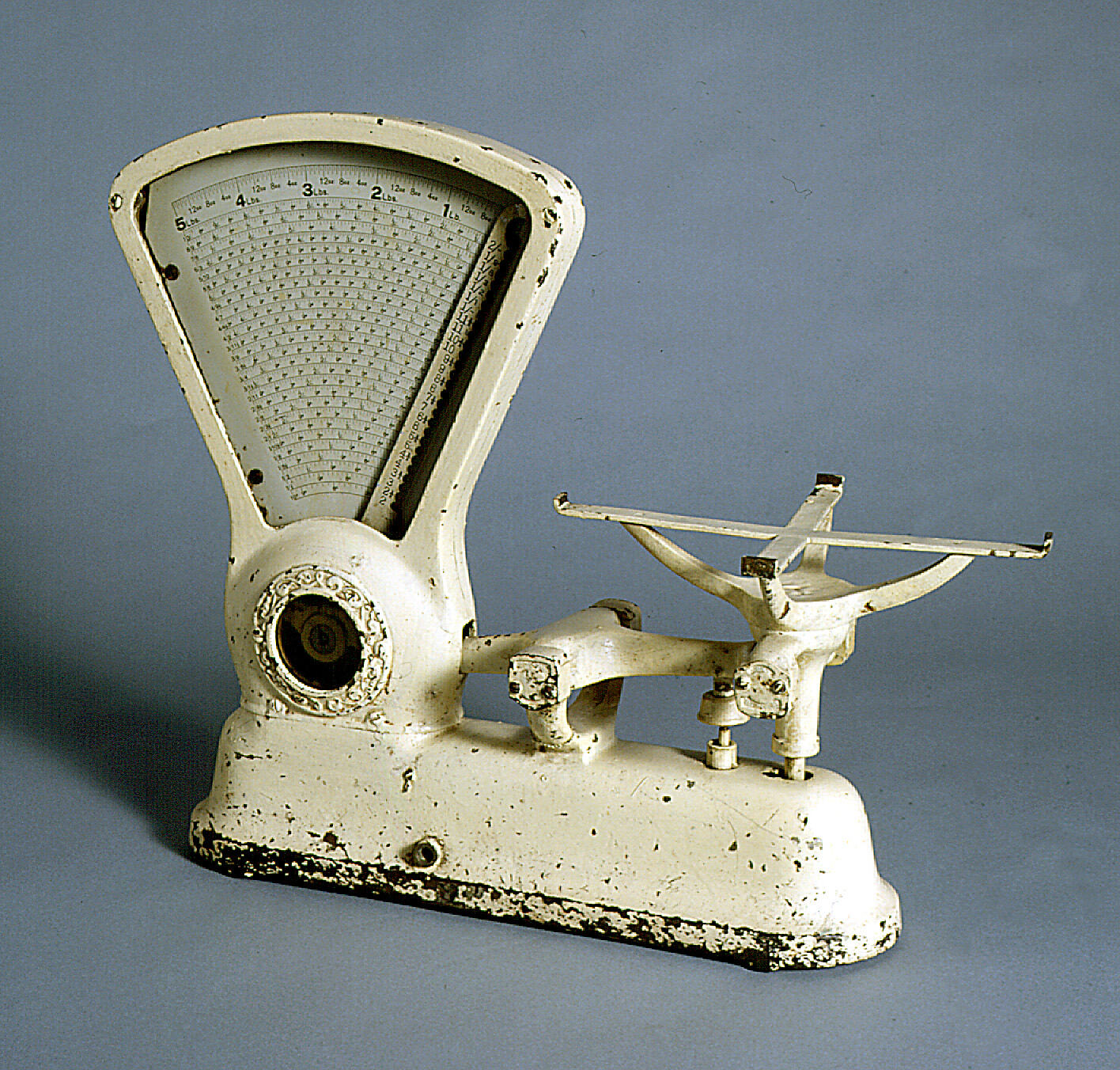 Cast iron, painted cream. Piece of plate glass sits on the balance arm.