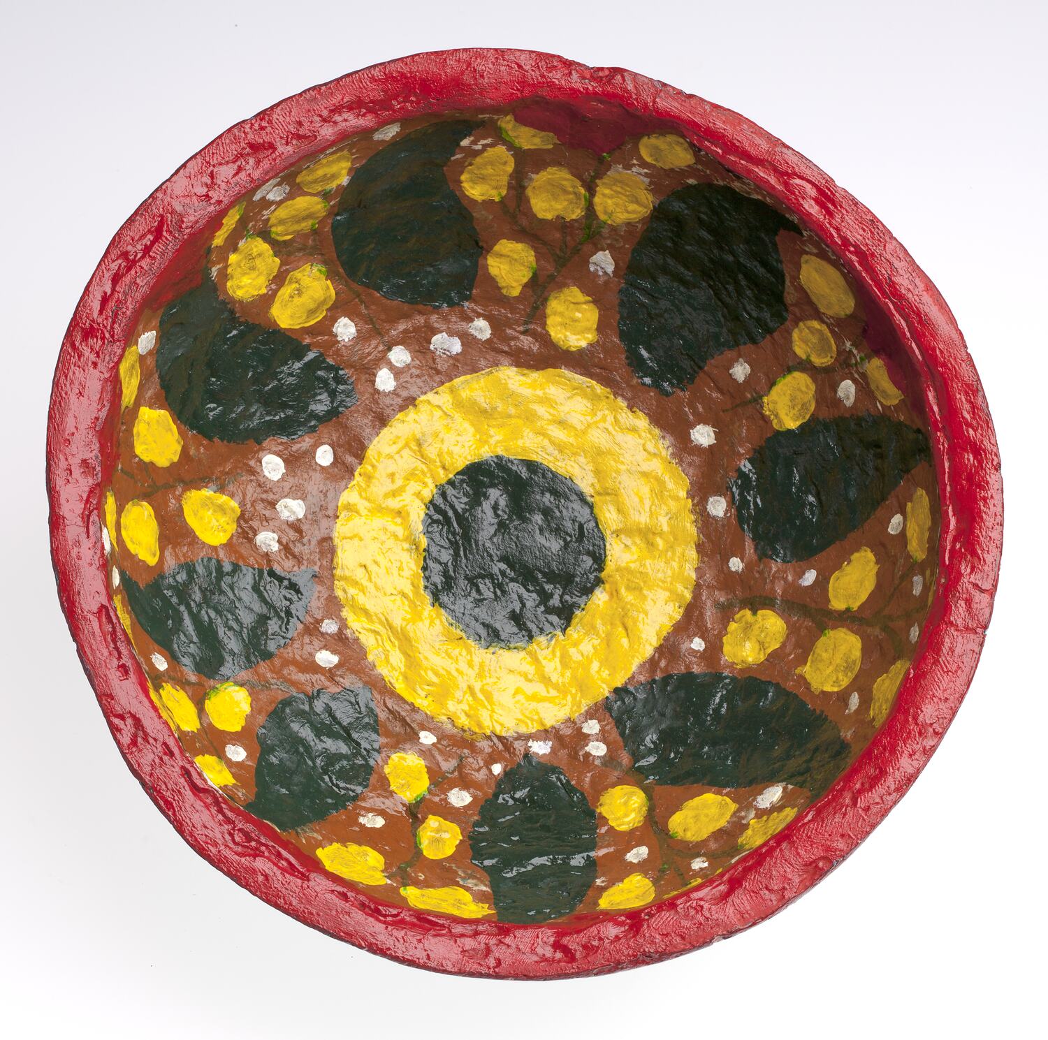 Circular bowl made of papier mache and decorated in oil paint. Final coat of varnish has been applied, though not evenly. Bowl is quite deep. Inside decorated with yellow and green centres, around which are painted leaves and [wattle blooms]. Ground is light brown. Edge painted red. Outside surface plain, red scalloped edge painted along rim, remainder of surface painted in aqua. All colours very bright.