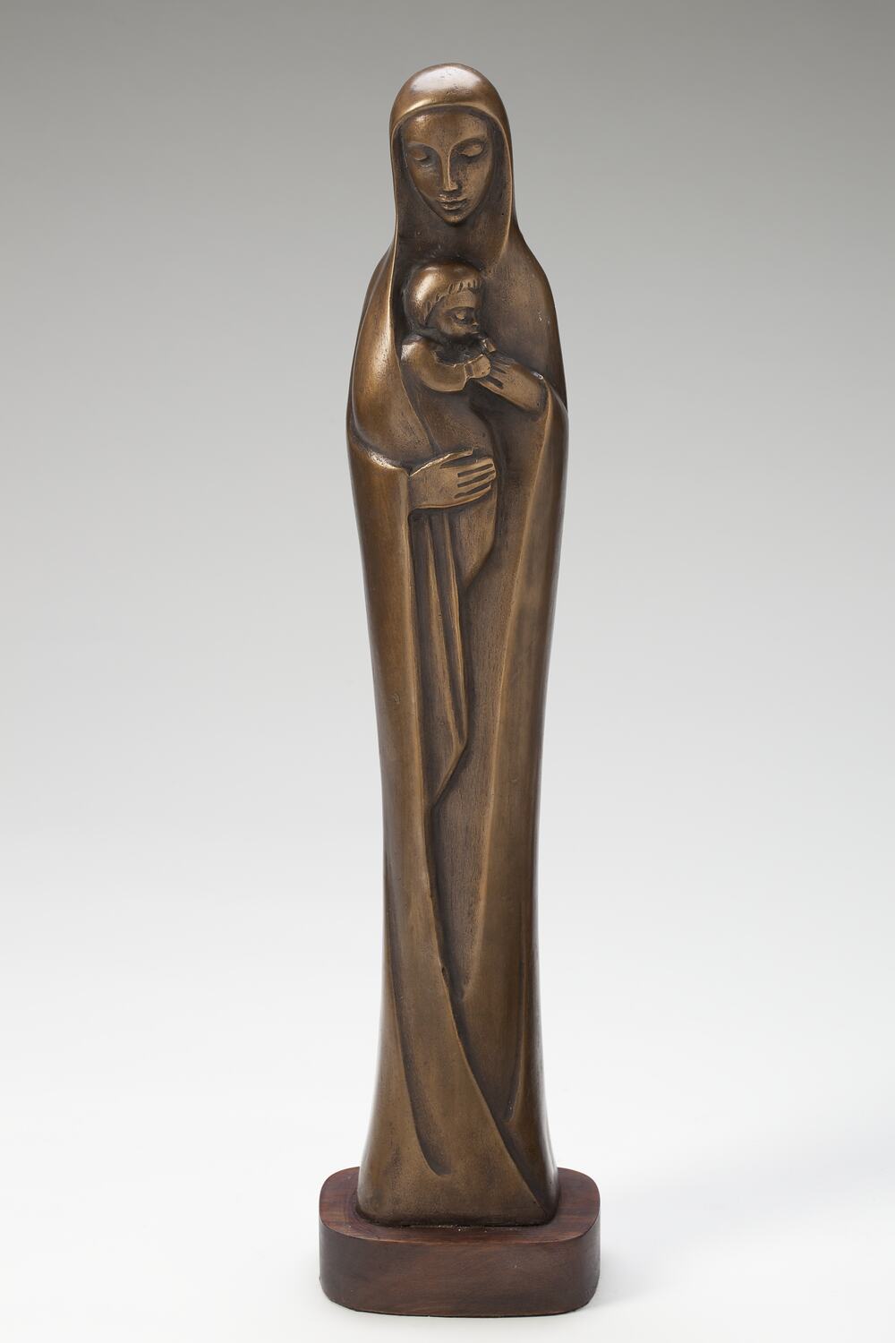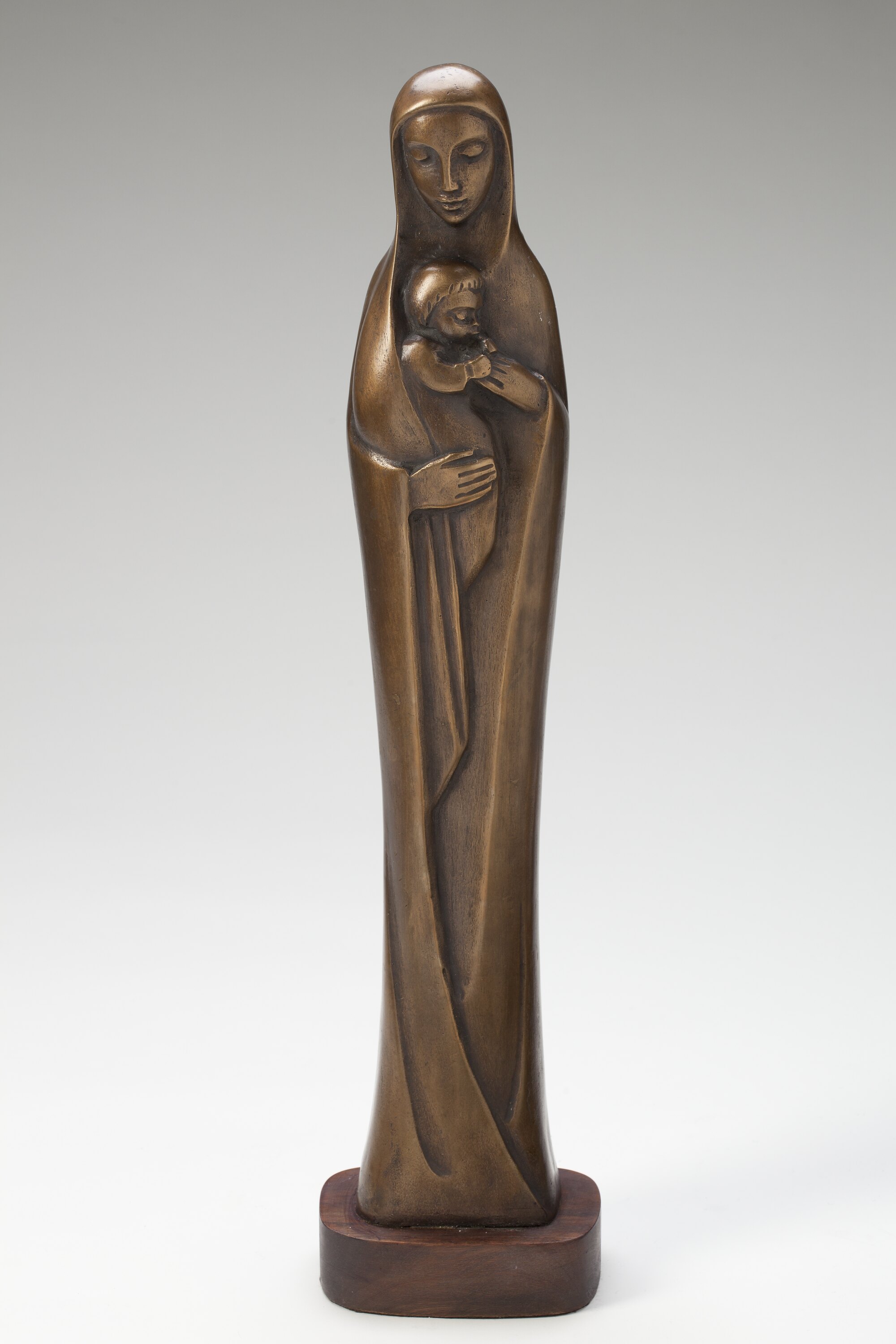 Bronze cast sculpture of the Madonna and Child. The sculpture is elongated and stylised, curves and verticals are emphasised. Mary stands draped in a cloak which reaches to the ground, she holds the baby Jesus against her breast.