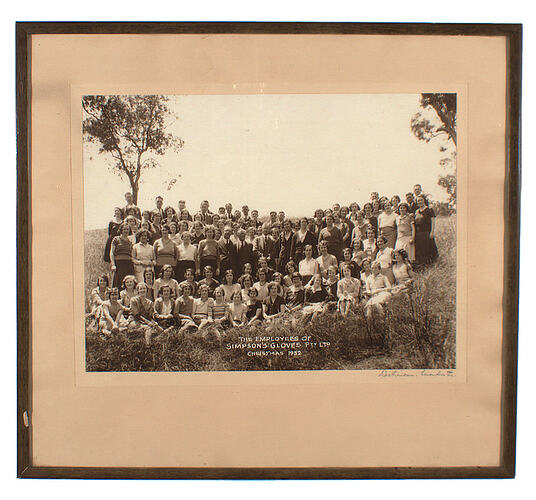 Wooden frame containing a group photograph of the managers and employees of Simpson's Gloves Pty Ltd, Christmas 1932.