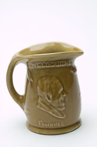 Moulded ceramic jug with light brown glaze. It has raised profile portraits of John Pascoe Fawkner and John Batman, one on each side.