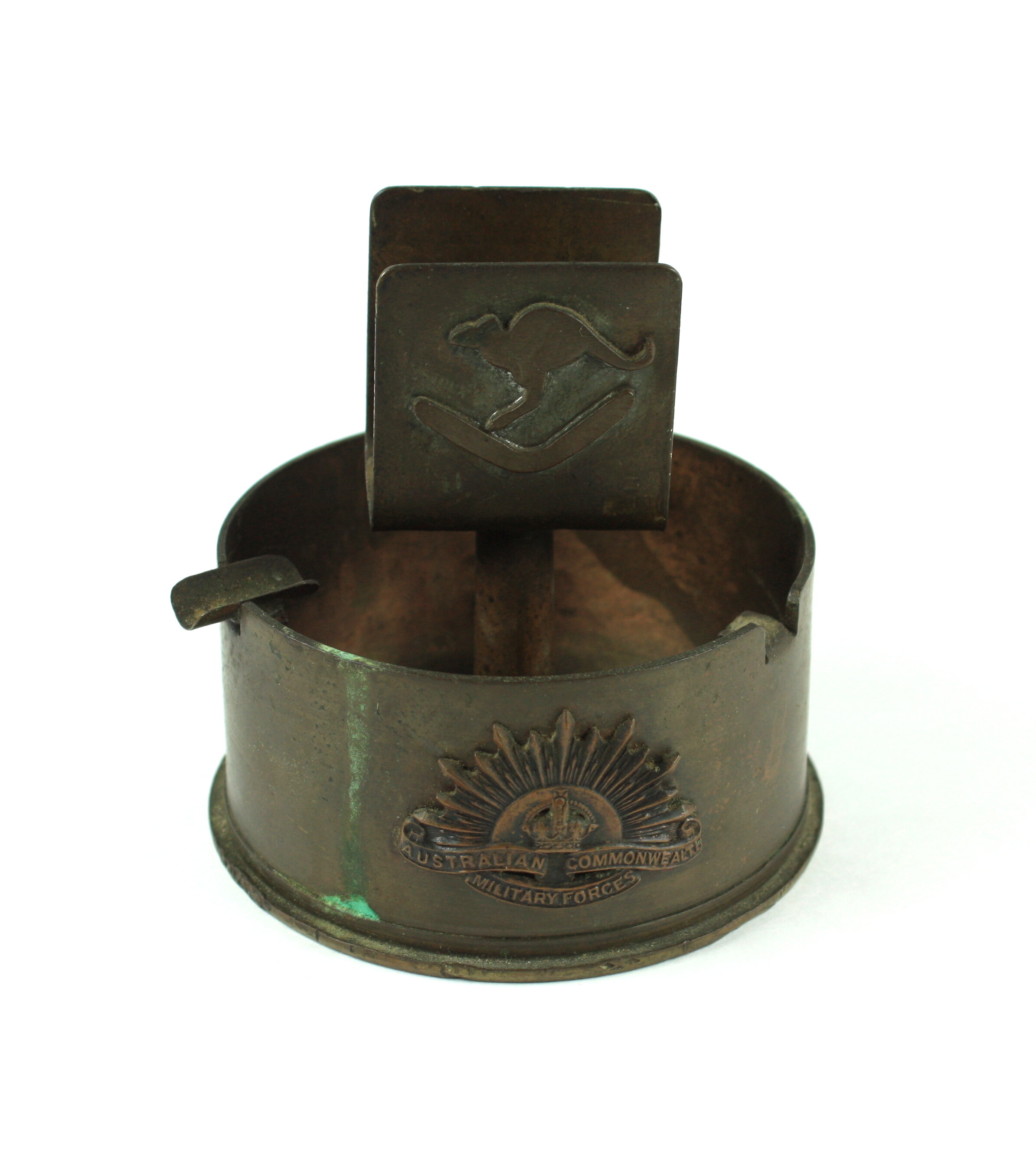 Metal ashtray with a matchbox holder attached through centre. Ashtray has army badge attached to one side with three sections for laying cigarettes. Match box holder is attached to inside centre of shell on a stem with a section that when a match box is placed over this section the match bow remains open ready for use. Kangaroo over a boomerang on one side of match box holder.