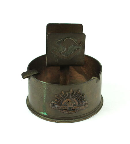 Metal ashtray with a matchbox holder attached through centre. Made from a used two-pound (2 lb) shell during World War II by a family friend of the donor while they were serving at Puckapunyal.