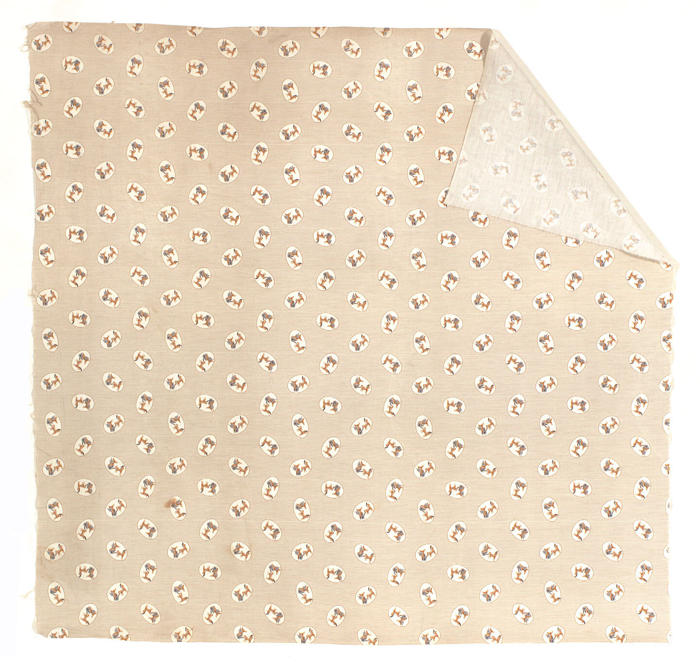 Width of semi-polished cotton fabric treated with rosin. The fabric has a pattern with horses and chariots in brown on a finely striped background of white and brown.