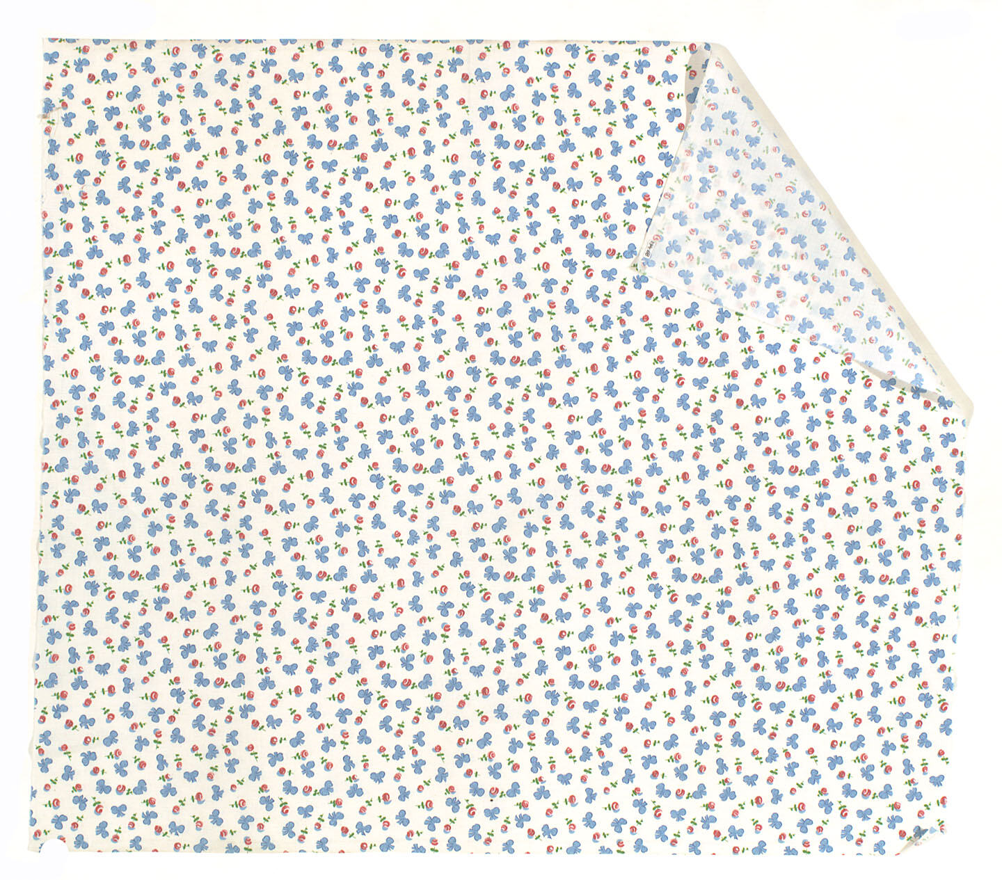Width of white cotton fabric with bow and stylised flower pattern in blue, green and red.