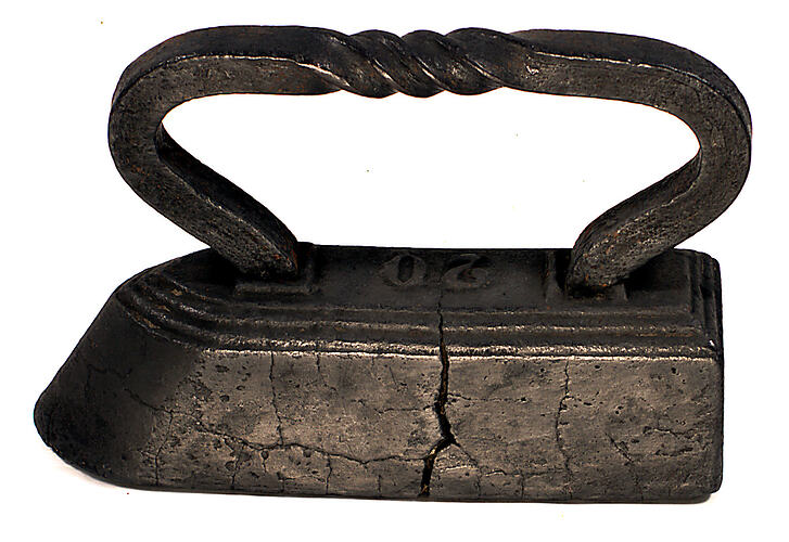 Flat iron is a long narrow block of cast iron, 8cm high. It is square at the back and curves into a blunt point in front. Sides are straight except at the front, which slopes backward toward the top. A join between the sides and the top slopes in 3 shallow steps. Iron has a heavy crown- shaped wrought-iron handle, reaching the length of the iron and with spiralled twist in centre. A large crack runs across base and up both sides. Iron is outrageously heavy!