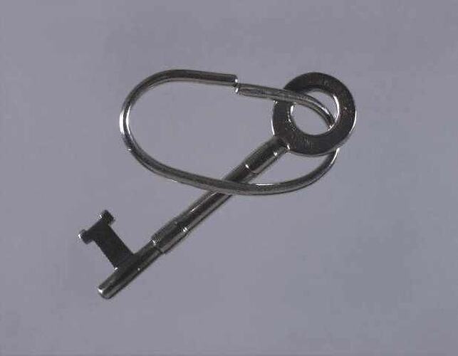Security key for Mayday Hills Hospital manufactured by J. Hubball, circa 1970. It was used by a nursing attendant at Mayday Hills Hospital, a psychiatric hospital in Beechworth, Victoria. A similar key was issued to each staff member. It was used to obtain entry to Mayday Hills and to open the many locked doors within the hospital. This key is an example of the security equipment used in psychiatric hospitals in Victoria, Australia.