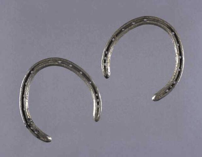One of a pair of aluminium horseshoes, showing signs of wear. Each shoe is a mirror image of the other, the curve being slightly irregular on one side. Each shoe has fourteen nail-holes, which are in a groove which runs the length of the shoe. The three nearest to each end are closer together than the rest.