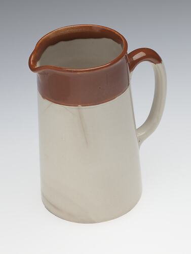 Fawn cylindrical ceramic jug with a curved lip and an oval shaped handle on one side. Around the top is painted a wide brown band which extends into the top of the jug and along the top of the handle. The sides taper slightly inwards from the base. The surfaces of the jug have been glazed.