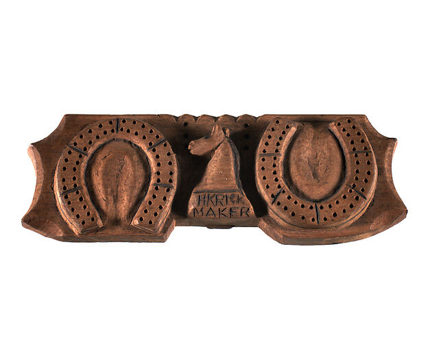 Cribbage board featuring horse and horseshoes motifs, made in 1936 by patient at Ararat Mental Hospital, Victoria, Australia.