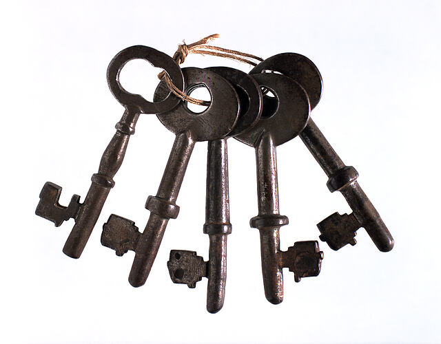 Set of five iron keys used at the mental health hospital Yarra Bend Asylum, possibly between 1848-1925. They were used to unlock the doors of wards and possibly work areas at 'Yarra Bend Lunatic Asylum', Victoria, Australia.