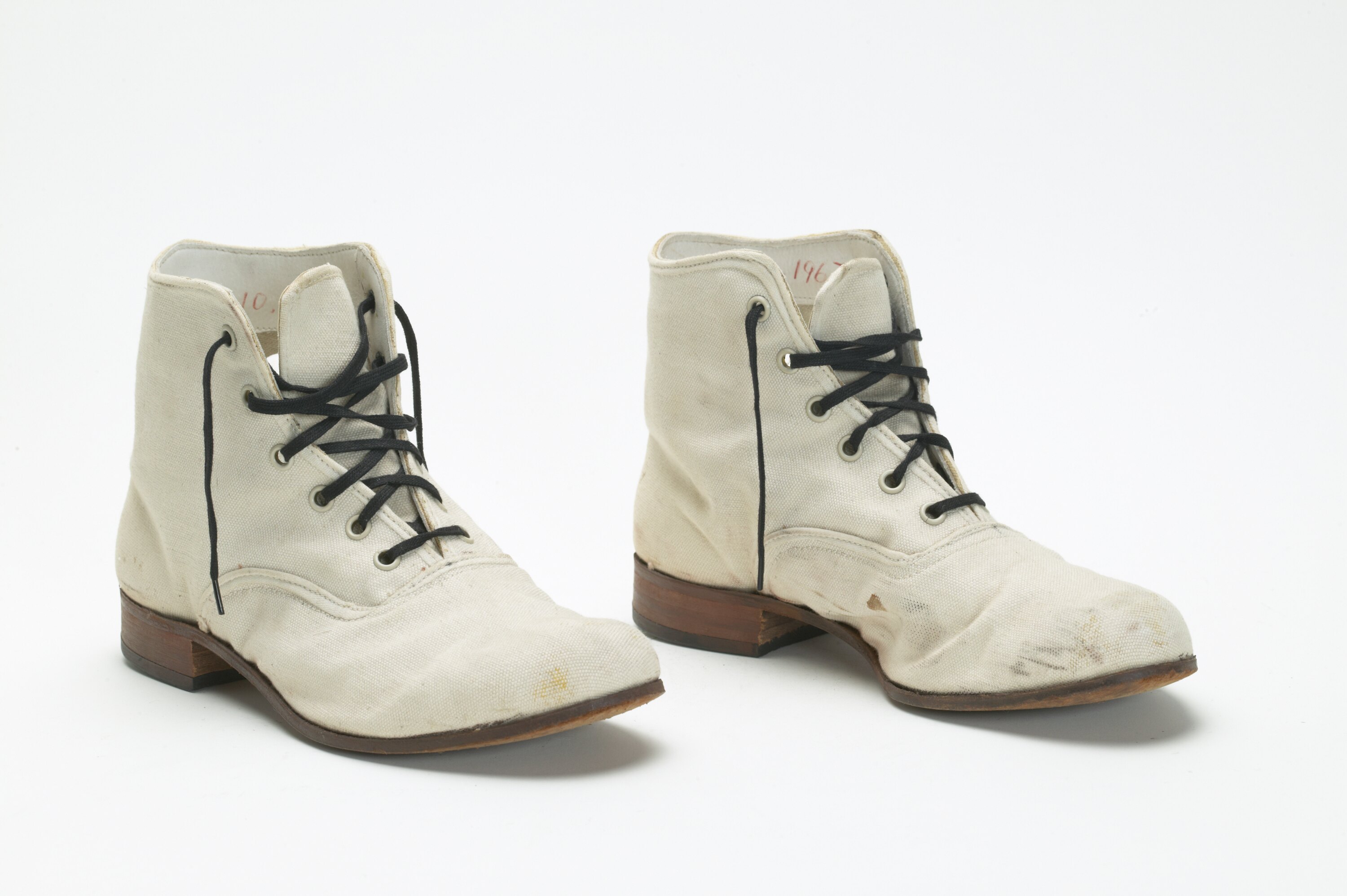 Pair of cream canvas boots, size 9, with black laces. Worn by a patient before 1950 at Aradale Psychiatric Hospital. Aradale Psychiatric Hospital was built as the 'Ararat Lunatic Asylum' between 1864 and 1867, and is important as a record of the changing approaches to the treatment of mental illness in Victoria - from institutional confinement to treatment and rehabilitation.