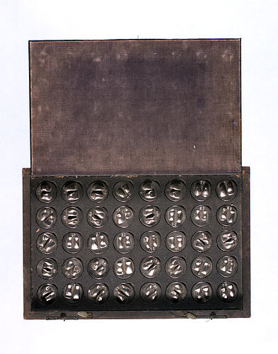 Box containing 40 silver dental molds used at a metal health hospital Lakeside Mental Hospital Ballarat Victoria Australia circa 1910. Dental molds were used to make an impression of a patients teeth in order to make a customised dental replacement.