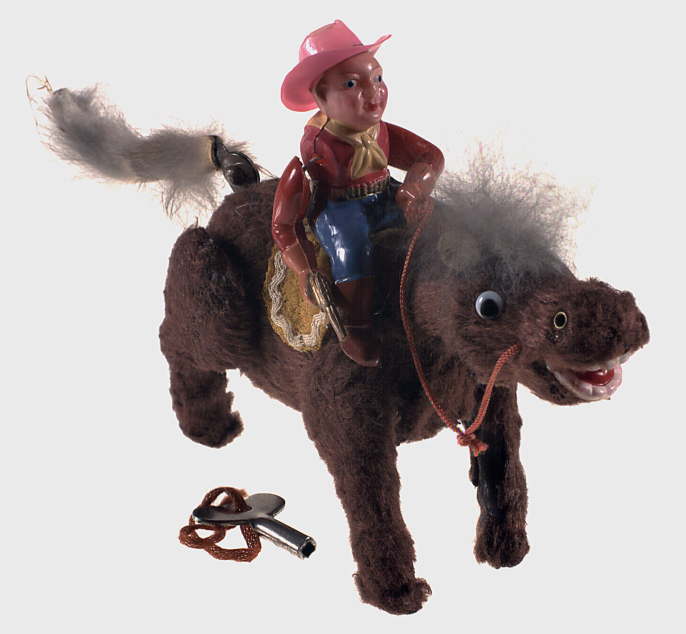 Metal toy horse covered in brown fur fabric with moveable legs and tail, operated by metal wind-up key. Painted celluloid cowboy sits on yellow saddle holding reins, with movable arms. When horse is wound up, legs and tail move as if it is running. Key is detachable. There are metal stirrups on the horse. The cowboy wears a pink hat, red shirt with yellow neck-tie, blue trousers, deep red boots and carries a pistol.