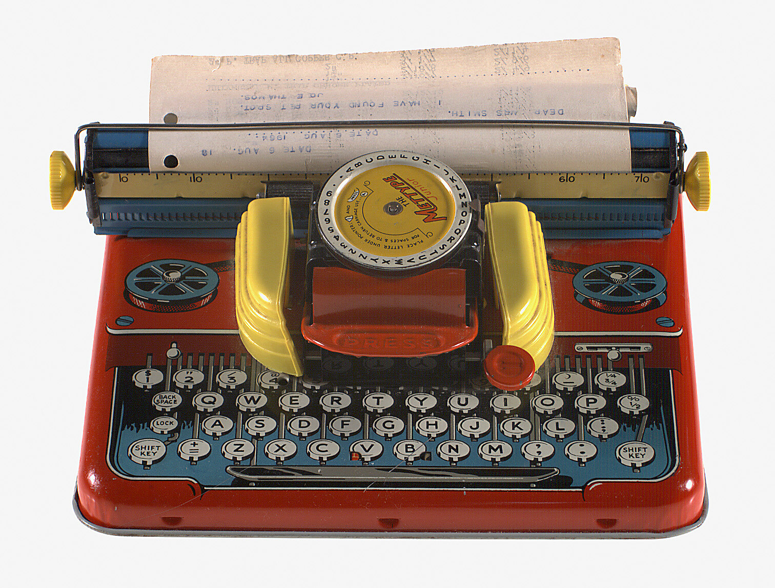 Box: Printed, lid, red ink: FOR TYPING LETTERS, NOTES, LABELS, CLUB REPORTS ETC. USEFUL & INSTRUCTIVE/ METTYPE JUNIOR/ WORKING TOY TYPEWRITER. Side and front, similarly inscribed with addition of: ARTICLE NO 4315/MADE IN GT. BRITAIN/IDEAL FOR BOTH GIRLS AND BOYS. Typewriter: Painted, daisy wheel and back of typewriter: [extensive text]. Piece of paper on platen: (text)/6th August 1964/(text)