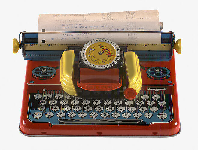 Box: Covered corrugated tan coloured cardboard box with yellow and red printing on 2 sides, front and lid. The lid has red printed inscription and printed picture of head and shoulders of boy and girl and toy typewriter. Front has inscriptions in two yellow with red outlined rectangles. The two sides have identical yellow with red outlined squares with inscriptions insde. The back and base of box is plain cardboard. On the base of box, there are four rusted and loose staples. Typewriter: Painted red metal(tin) toy typewriter with yellow plastic guide knobs. Painted blue, white, grey and black keyboard. Blue paper roller with typed paper inside. Daisy wheel attached to keyboard with red press button which lifts daisy wheel. On back of typewriter are instructions for use numbered 1-4. Daisy wheel has inscriptions.