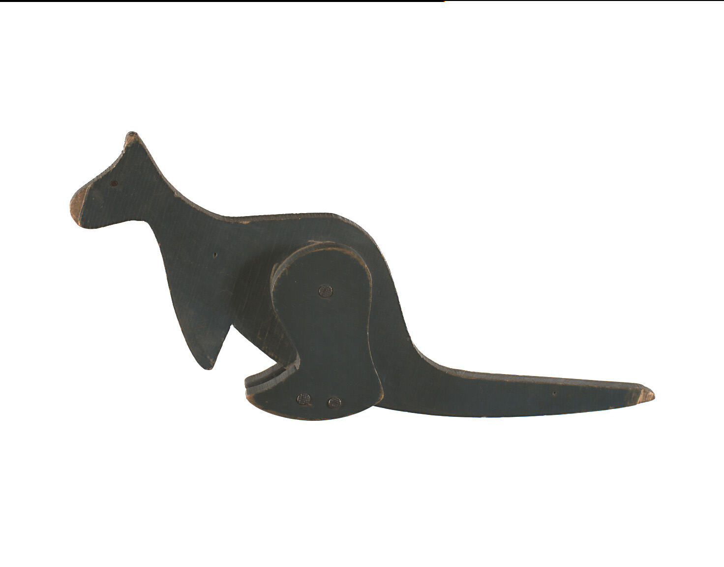 A long, wooden plank with two wooden kangaroos. The toy consists of: A long, wooden plank, red/orange in colour, resting on a wooden movable base. The base is nailed in with two nails. The plank has slightly raised sides for the two kangaroos to fit in between. A wooden kangaroo painted blue/grey with two legs fixed on both sides by nails and a logn, tapering tail. Two small nails fixed on either side of its head act as eyes. A plain wood kangaroo, same shape as the other but smaller. Its movable legs are secured by nails and there are two nails through the feet.