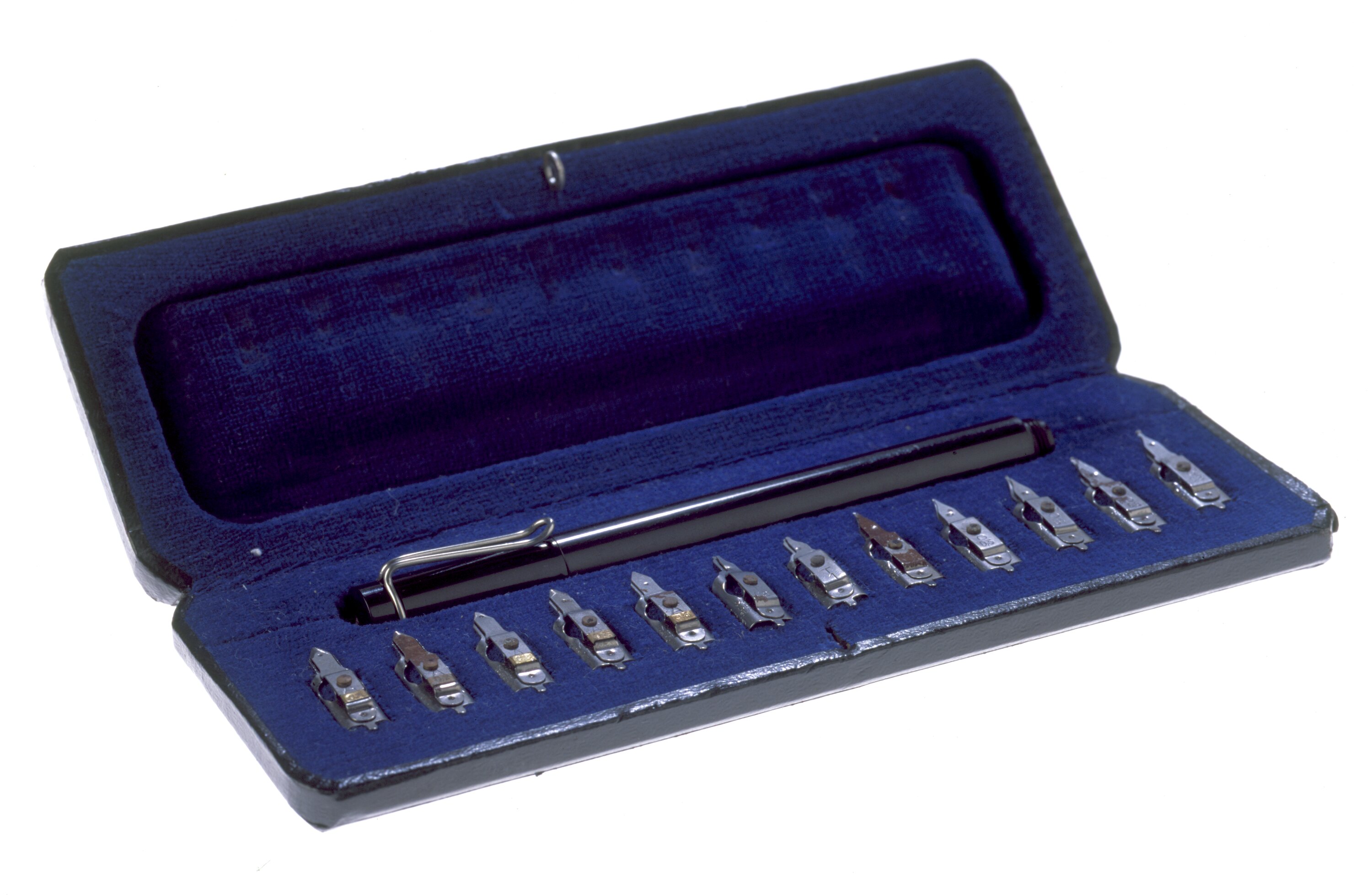 Graphic pen with assorted nibs in a box which belonged to Herbert Kann. Herbert was living and working in Singapore with his parents when he was detained as an enemy alien and transported to Australia for internment at Tatura. He was released from Tatura in 1942 at the age of 33. He married fellow Austrian Jew Marion Edith and worked as a fitter, draughtsman and electrical engineer in Melbourne.