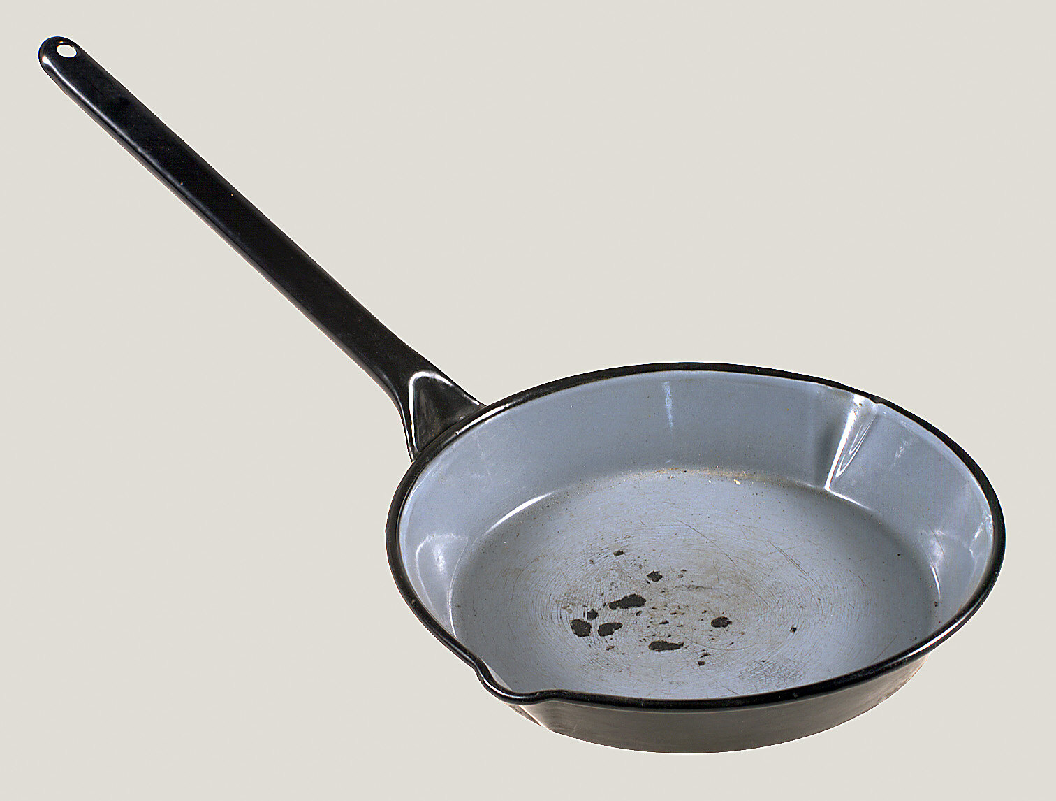 Black enamalled frying pan with grey enamel on inside. Pan has pouring indentations at each side and long, rolled-metal handle is soldered to pan.