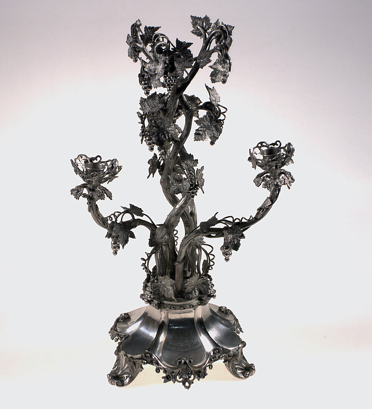 Ornate silver plate candelabrum, for three candles. Vine branches, vine leaves. Engraved: "Presented by/ the Officers of/ H.M.Gaol/ Melbourne/ to/ Peter Dwyer, Esqr./ Governor, on his removal to Pentridge."